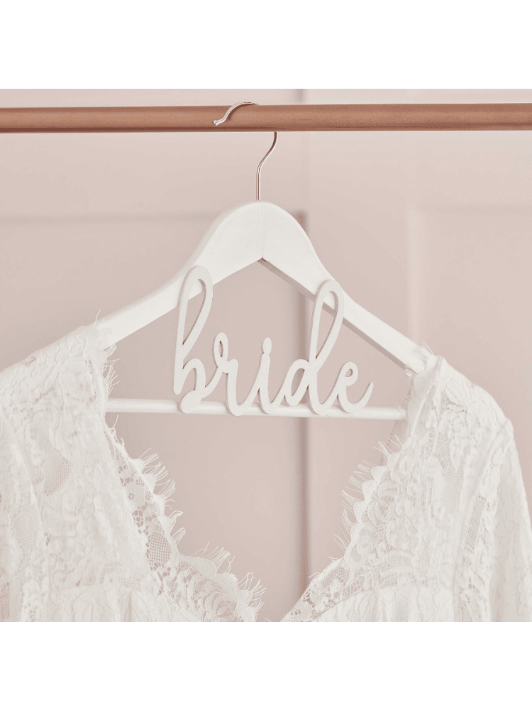 Op je trouwdag draait het allemaal om de finishing touches voor de meest perfecte en magische dag! Maak je in stijl klaar voor je grote dag met deze prachtige Bride kledinghanger. De bruid kan haar jurk eraan ophangen terwijl ze zich klaarmaakt. Bovendien zal deze trouwjurkhanger van wit hout er prachtig uitzien op je trouwfoto's in de ochtend.