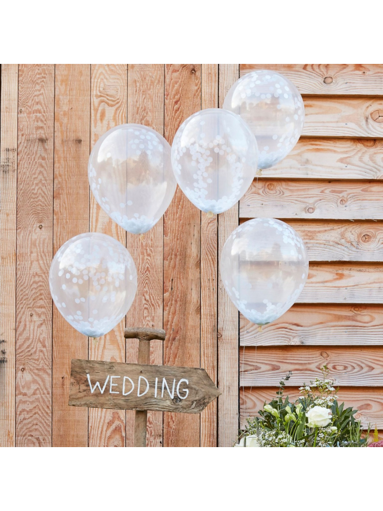 De ballonnen zijn transparant en gevuld met witte confetti.