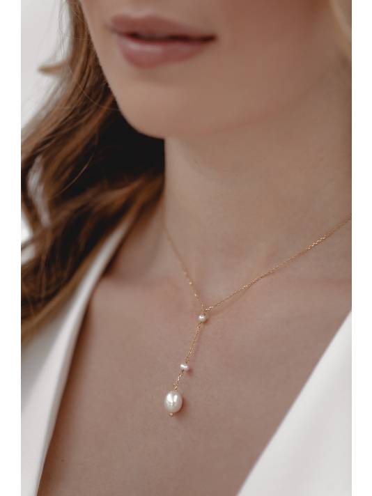 Delicate ketting met twee kleine en één grotere zoetwaterparel - het taps toelopende ontwerp is perfect voor bruidsjurken met V-hals.