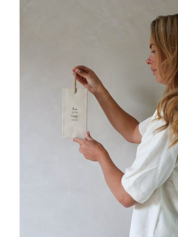This charming Leeff tile has a unique shape and a handwritten message: This Is My Happy Place. Hang it on a wall or place it on a shelf. It adds warmth to any room and makes a sweet, thoughtful gift for engagements, bridal showers, or a cozy home moment.