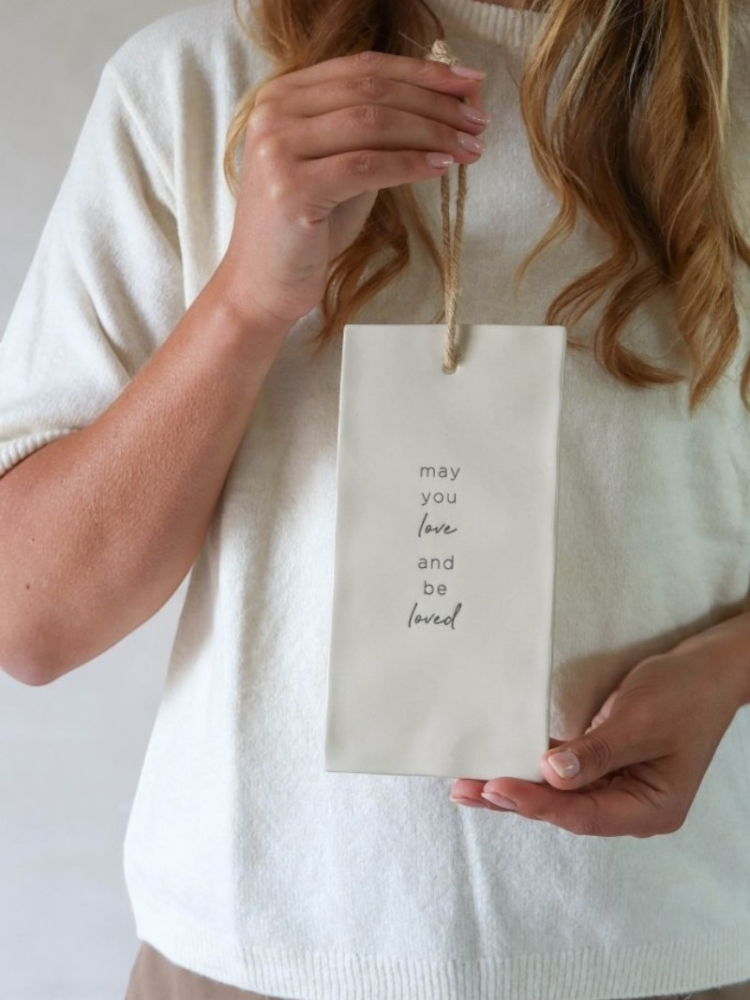Een bijzonder tegeltje met unieke vorm en handgeschreven wens: moge je liefhebben en geliefd worden. Geef het een plaatsje op de muur of op een rekje. Een warm, persoonlijk cadeautje om te schenken of te krijgen bij een grote dag of intiem moment.