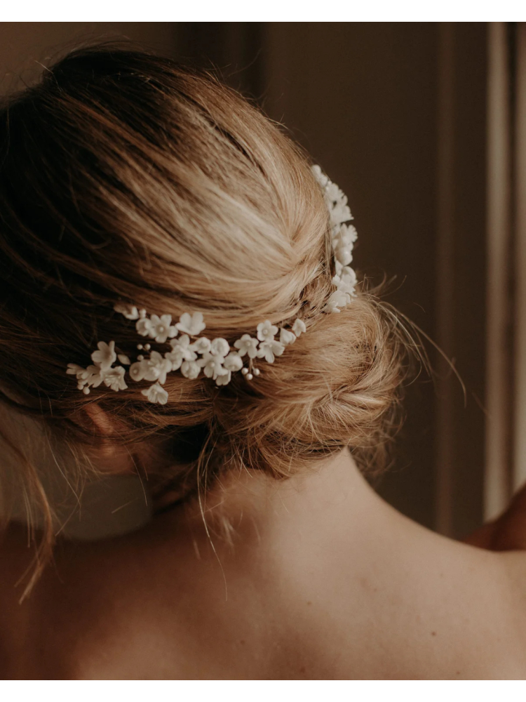 De Blanche-kam is een zacht, romantisch sieraad met kleine, handgemaakte bloemetjes van koud porselein en verfijnde details van parelmoer. De gebroken witte (zacht ivoorkleurige) tinten gaan prachtig op in je haar voor een natuurlijke bruidslook. Superlicht, 12 cm lang en handgemaakt in Parijs — perfect om aan één kant te dragen of dubbel te doen voor een voller effect.