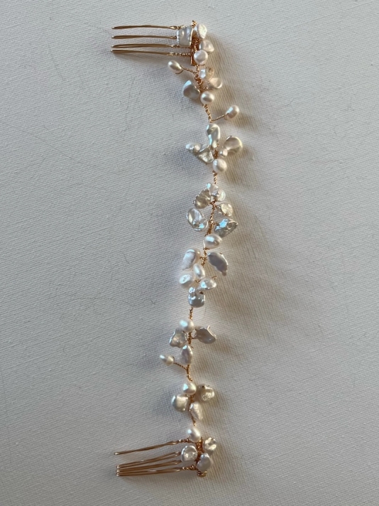 Nova Haarstreng Goud door Sally Jane Bridal is een prachtig handgemaakt, flexibel haaraccessoire dat zachte, natuurlijke elegantie toevoegt aan elke bruidsstijl. Met unieke ruwe parels en glanzende zoetwaterparels op een fijn goudkleurig draadje creëert deze 18 cm lange haarrank een romantische, organische uitstraling. Het lichte, buigbare ontwerp maakt het gemakkelijk om in vlechten te verwerken, rond een lage knot te wikkelen of in een half-updo te stylen. Perfect voor bruiden die op zoek zijn naar een minimalistische, boho of romantische touch.