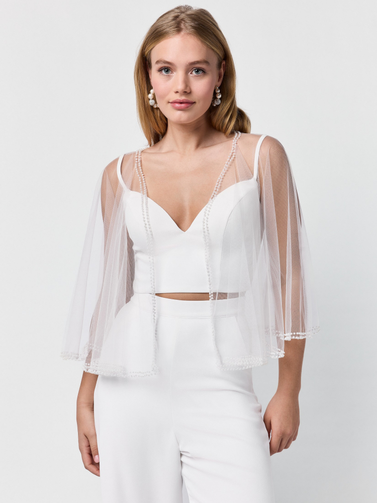 The Poirier C-75104 Cape in ivory tulle features two rows of pearls at the edge. A graceful, lightweight layer that adds elegant sparkle to your bridal look.