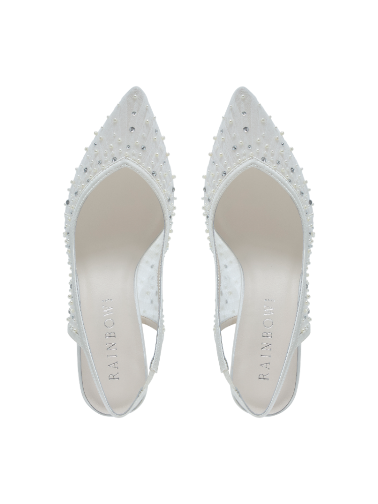 Rainbow Club Lucia Slingback bruidsschoenen brengen romantische sparkle en luchtig comfort samen. In delicate ivoor tule met fonkelende kristaldetails, een elegante puntneus, slingback model en een steunende blokhak van 7 cm.